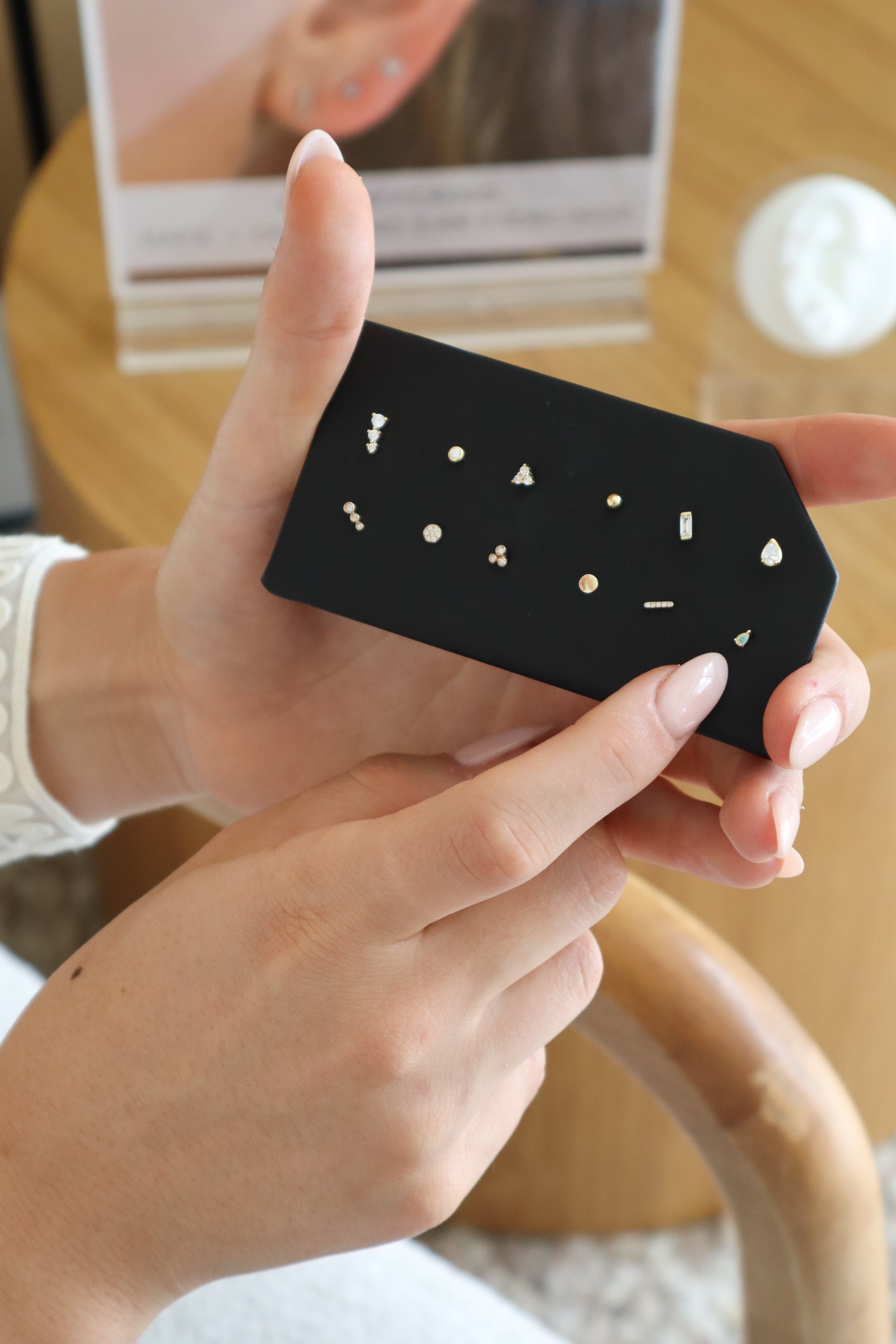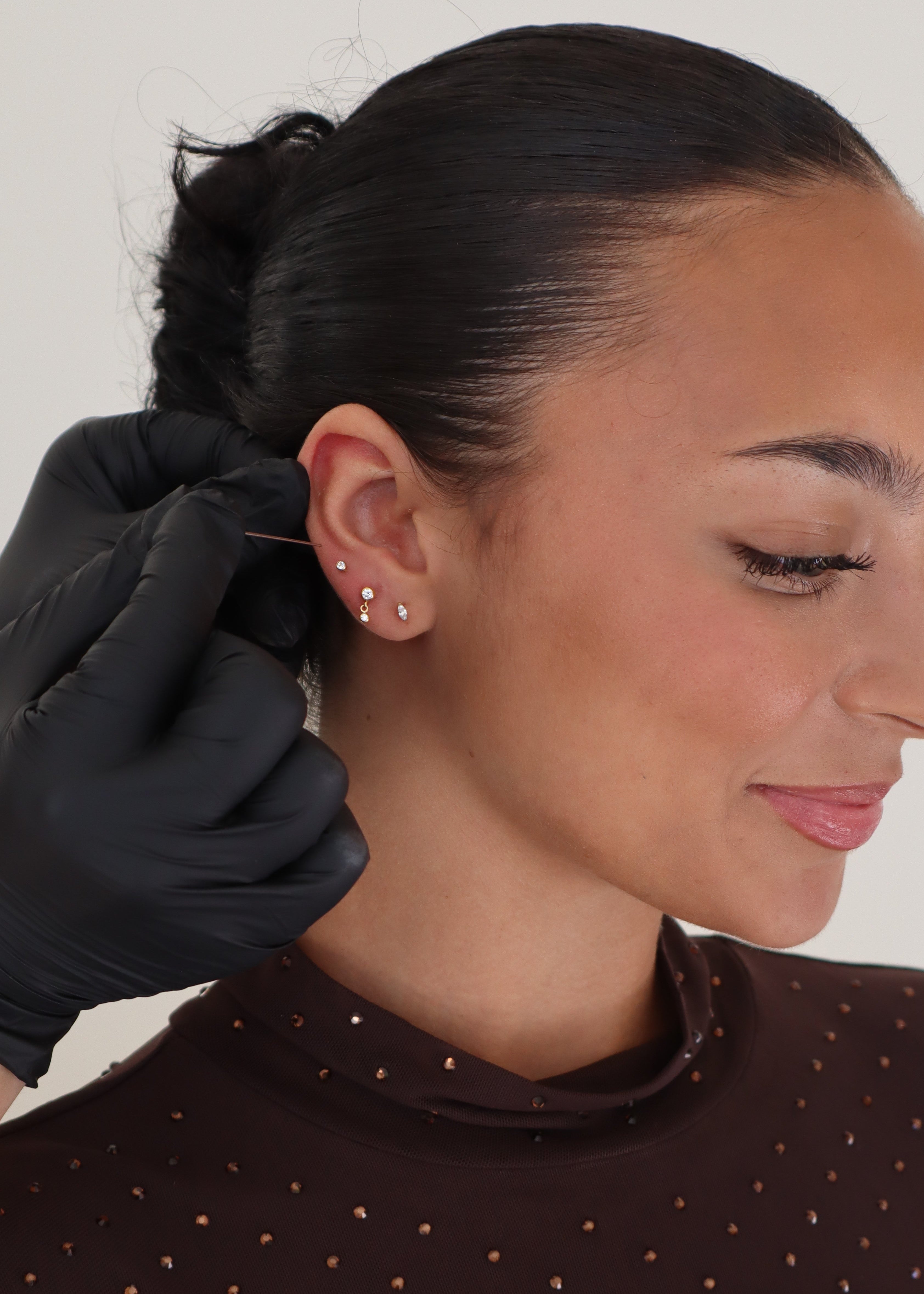 Our experienced piercers use a single-use, sterilized hollow needle to ensure maximum safety and cleanliness, making the process more comfortable and less traumatic for your ears. No piercing guns, ever.